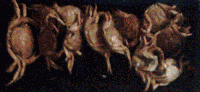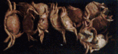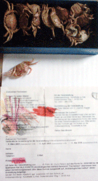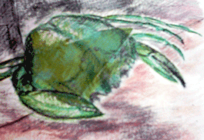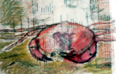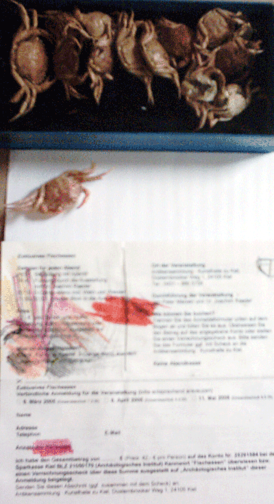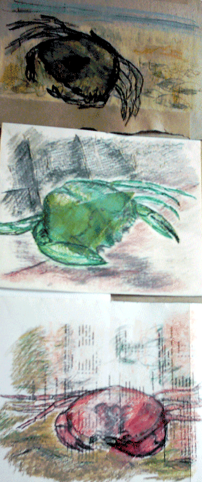 Bei diesen Zeichnungen diente das Papier mit Schriftzeichen der Einteilung von Flächen und farbigen Betonung. Die Krebse wurden auf eine collagierte Fläche gezeichnet. Die Farbe des Papiers gab die folgende Farbe der Krebse vor.